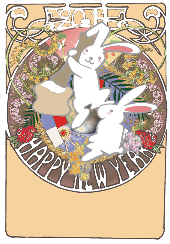 さてさて今年の年賀状は「豪華ミッシャ風」でございます。本当は「東南アジア風のギラギラした仏様風」にしたかったのですが,なかなかうまく描けなくて,ちょっとおもしろみに欠けるデザインになってしまいました。途中の下書きと完成版もアップしておきます。